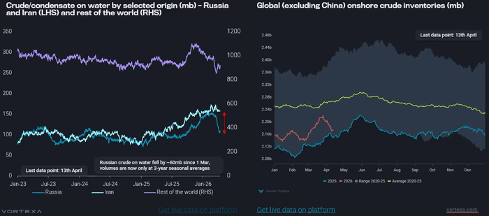 左図: Crude/condensate on water by selected origin (mb) – Russia and Iran (LHS) and the rest of the world (RHS) | 右図: Global (excluding China) onshore crude inventories (mb)