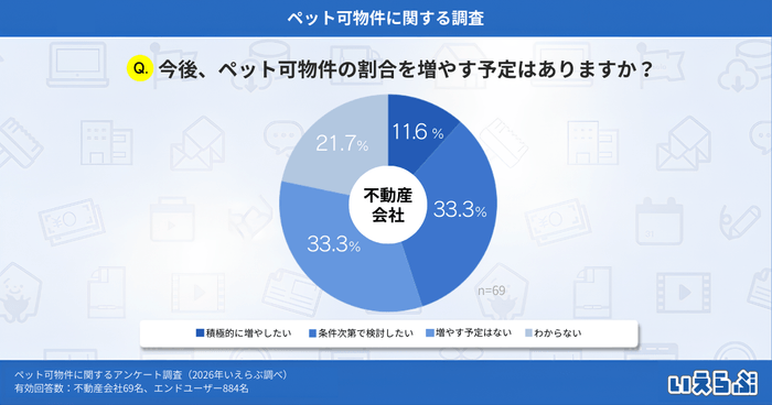 不動産会社への「今後ペット可物件を増やす予定はありますか?」という質問では、「積極的に増やしたい」(11.6%)、「条件次第で検討したい」(33.3%)、「増やす予定はない」(33.3%)、「わからない」(21.7%)という結果となりました。