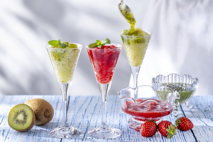 シチリアの心地よい海風をイメージした爽やかな苺とキウイの2種のグラニータ。苺の甘酸っぱさとキウイの清涼感が、初夏の暑さを忘れさせてくれます。