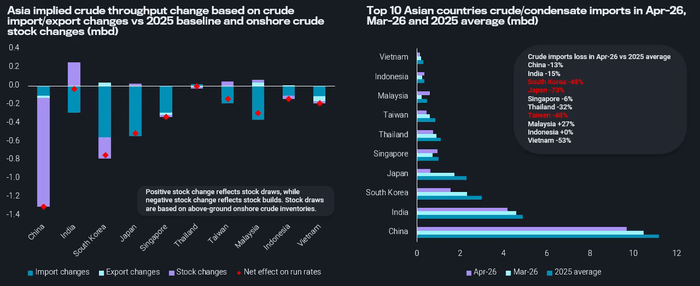 左図: Asia implied crude throughput change based on crude import/export changes vs 2025 baseline and onshore crude stocks (mbd) in Mar and onshore crude inventory changes in Mar (mbd) 右図: Top 10 Asian countries crude/condensate imports in Apr-26, Mar-26 and 2025 average (mbd)