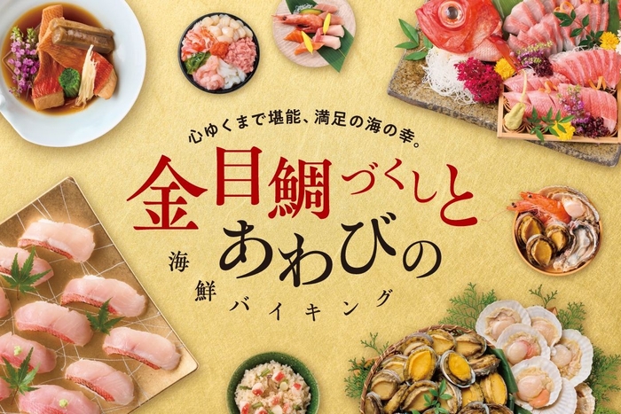 大江戸温泉物語Premium 伊東ホテルニュー岡部限定で「金目鯛づくしとあわびの海鮮バイキング」が新たに登場します。お造り、握り、煮付けなど、金目鯛を丸ごと味わいつくす贅沢な料理に加え、風味豊かなあわびの海鮮浜蒸しもすべて食べ放題。心ゆくまで海の幸を堪能し、幸せなひと時をお過ごしください。