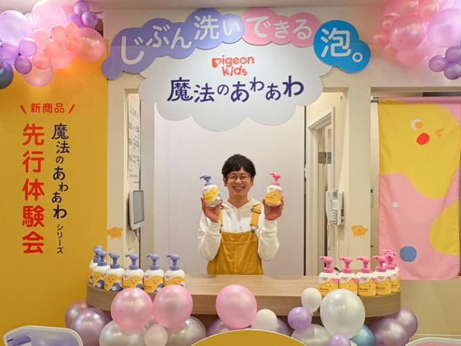 新商品「魔法のあわあわボディソープ」「魔法のあわあわシャンプー」は、しっかり洗うことで泡の色が変化し、子どもが楽しみながらじぶん洗いができるようになる商品。木下ゆーきさんは魔法のように色が変わる泡を披露し、子どもたちの自分で洗ってみたい気持ちを引き出しました。さらに、事前にご自宅で商品をお試しいただいた木下さんは「うちの4才の子どもがまさにこの商品で、じぶん洗いができました」、「青(ボディソープ)とピンク(シャンプー)の泡があるので、子どもと”お風呂入る?”ではなく、”青とピンクどっちからする?”とお風呂に入ることを前提に話すことができるのがすごい」という実体験も交えて商品の魅力を語りました。