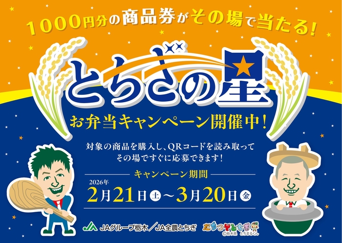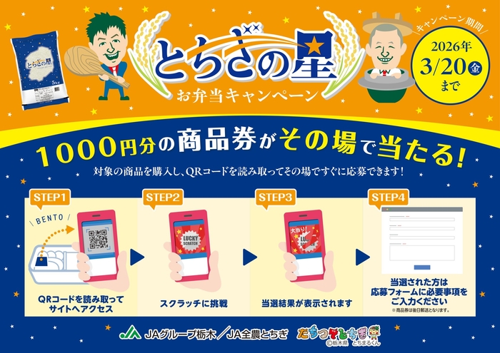 ・「とちぎの星」を使用した対象のお弁当に貼付されたQRコード記載のシールを読み取り、スマートフォンから応募すると、当選者に1,000円分の商品券がその場で当たります。