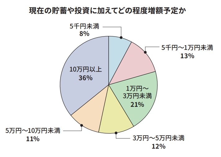 さらに、「貯蓄・投資の習慣」または「投資金額」を見直す層では、増額「10万円以上」が36%で最多、「1万円~3万円未満」が21%となり、約6割が3万円以上の増額を検討していました。