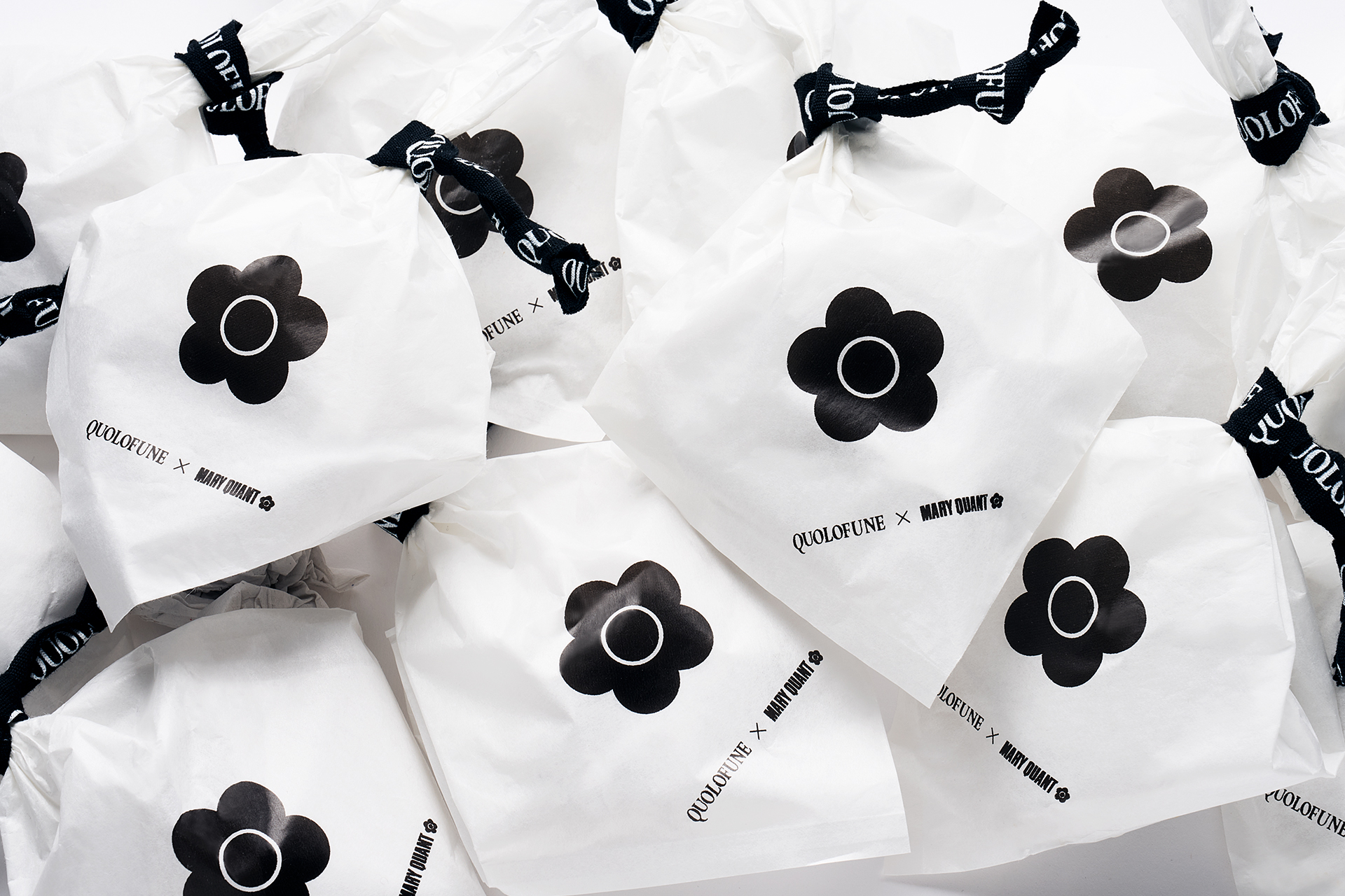 パッケージは「お菓子を丁寧にお包みする」という点にこだわり、ひとつひとつ人の手で包装しています。コラボレーション企画ではどら皮に「MARY QUANT」を象徴するブランドのアイコンであるデイジーの焼印を施し、モノトーンの特別パッケージでお包みしました。