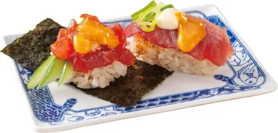 7kg以上の大ぶりなかつおを使用した「かつお卵黄醤油 食べ比べ[2貫][ピリ辛ユッケ風・おかかマヨ]」(290円・税込319円)も登場します。