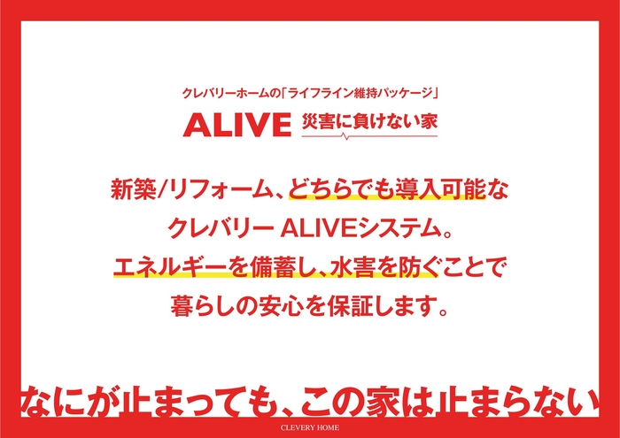 主な設備として、太陽光発電システム、蓄電池、ガスと電気のハイブリッド給湯・暖房システム、EV等と連携可能な電源設備、貯タンク、止水板などを組み合わせ、停電や断水といったライフラインの寸断時にも、日常に近い生活を維持できる住まいを提案しています。