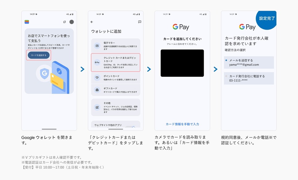 Vプリカギフトは本人確認不要です。電話認証はカード会社への発信が必要で、受付は平日10時00分~17時00分(土日祝・年末年始除く)です。