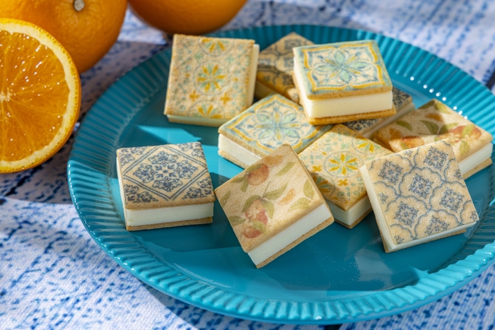 シチリアの鮮やかなタイルアートをモチーフにしたクッキーで、オレンジとホワイトチョコのムースをサンドした一品。目にも美しい彩りと、柑橘の爽やかな風味が広がります。